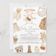 This boho gender-neutral baby shower by mail invitation features baby clothes such as a mobile with a bear, romper, pants, stuffed bear/animal, jacket, boots, diaper, bib, bottle and pyramid toy. The reverse side features a light beige/tan background with baby toy patterns. Personalise it for your needs. You can find matching products at my store.