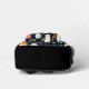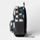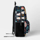 This cute backpack for kids or adults has a pattern of funny boho style cats and leaves in bright colours. Colours used include gold, salmon orange, blue, white, and black. The bottom sides of the bag is solid black, making a nice contrast for all the colour.