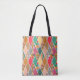 This tote bag has a Boho design of diamonds with different patterns alternating with solid diamonds in a Boho colour palette.
