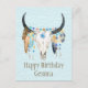 Modern and slightly funky watercolor illustration of Boho feathers and beads decorated cow / steer skull with customisable "Happy Birthday" text on a light blue textured background.