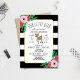 A baby shower invitation featuring an illustration of a baby deer wearing a pink flower crown. Personalise the text. Background is black and white striped pattern.