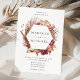 Elegant, unique floral wedding invitation featuring your names inside of a hexagon frame of burgundy, purple, blush, and coral watercolor flowers and lush foliage in rich beige and brown earth tones. Personalise the floral invitations by adding details such as wedding date, time, venue, and reception information. The invite reverses to a light beige watercolor background.