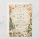 A romantic desert-inspired wedding design with watercolor cactus, soft peach florals, butterflies, and muted mountain scenery. Perfect for boho, southwestern, and rustic outdoor weddings.