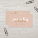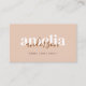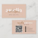 This business card features a stylish and modern design with a soft blush background. The front showcases the name in a bold serif font combined with an elegant script overlay, creating a chic contrast. The title is displayed below in clean, minimalist text. On the back, the same name style appears at the top, followed by a large QR code on the left and neatly arranged contact details with icons on the right, separated by a thin vertical line. The overall look is sleek, professional, and perfect for a beauty or creative industry professional.