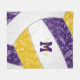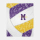 This boho volleyball themed fleece blanket for her features the realistic image of an abstractly oversized volleyball that has purple, gold and white panels - a continuous doodle pattern of paislies, flowers and feathers in white covers the volleyball's purple and gold panels - personalise with the athlete's name and monogram, varsity letter or jersey number - by katz_d_zynes