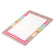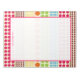A notepad featuring a sheer centre section outlined in pink over a background of rows of polka dots in various sizes and bohemian inspired shades of pink, green, blue, orange, yellow, and burgundy. Personalise with your name.