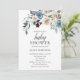 Boho baby shower features dusty blue and neutral beige flowers with dried leaves.