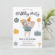 A charming design with a blue elephant, gifts, candy, flowers and elegant calligraphy! You can personalise this invitation with your own details.