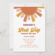 First trip around the sun, First Birthday Invitation with boho vibe sun and retro typeface lettering. Bold retro boho colour palette sunshine 1st birthday party invite.