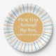 Boho First Trip Around the Sun 1st birthday party plates in blue and yellow.