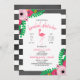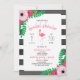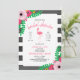 A wedding bridal shower invitation featuring an illustration of a flamingo silhouette at centre with floral designs at top left and bottom right corners. Design has a pink and black colour scheme. Personalise the text. Background is black and white stripes.