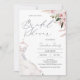 Elegant boho themed bridal shower invitation featuring a blush floral arrangement with pampas grass and a wedding dress. The modern calligraphy heading is an image that can be removed.