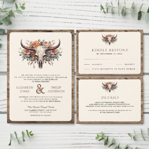 Amaze your guests with this western theme wedding invitation featuring rustic cow skull and beautiful earthy flowers. Simply add your event details on this easy-to-use template to make it a one-of-a-kind invitation.