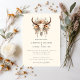 At the forefront of the invitation, a beautifully adorned cow skull takes centre stage, symbolising strength, resilience, and the spirit of the wild west. Surrounding it, a delicate array of earth-tone flowers adding a soft, boho romantic touch to the rugged backdrop.