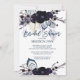 Beautiful Blue & purple flowers adorned with feathers with a modern chic hand lettered font bridal shower invitation