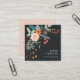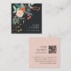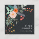 Lighthearted floral business cards in a unique square format feature a boho style bouquet in shades of coral and green, accented with a feather and greenery. Add your name and business name or title/occupation in the lower right corner, against a rich off-black background. Cards reverse to dark lettering on a contrasting blush pink background with a customisable QR code.