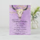 This Boho wedding invitation features a floral cow skull with pretty yellow flower string lights on a purple background. -