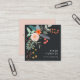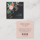 Lighthearted floral business cards in a unique square format feature a boho style bouquet in shades of coral and green, accented with a feather and greenery. Add your name and business name or title/occupation in the lower right corner, against a rich off-black background. Cards reverse to dark lettering on a contrasting blush pink background. Includes three social media icons and a field for your username.