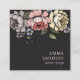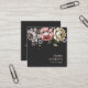 Painted style vivid floral blooms on a black unique square business card with your name and title, suitable to customise for many occupations. Hues of peach, rose, green, blue. Customise on the back of the card. Your name and title are in coloured type, and social media icons on the back.