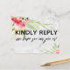 Both sides of this card were embellished with pretty watercolor flowers. In editable text "kindly reply" was placed, large and bold, on the front. In a modern casual handwriting, a graphic depicting "we hope you can join us!" appears below. On the back, the same unique font was used to create graphics that read "rsvp", "m", "kindly deliver to:" and "i promise to dance if you play:" All other text is editable. Use the template fields to personalise as much as you wish. The background is covered in a subtle marble graphic. // 100 //