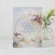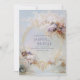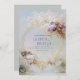 Invite your guests to a celebration of opulent romance and ethereal beauty with this exquisite wedding invitation. The design features a delicate thin gold circular frame set against a luminous soft ivory and pale pink backdrop, providing a radiant canvas. The bottom of the frame is anchored by an ornate baroque gold scrollwork medallion adorned with a subtle jewel accent. This entire composition is gorgeously framed by a lavish wreath composed of soft, layered beige foliage, feathery plumes, and blush pink, lavender, and pristine white flowers. Delicate, wispy white filler branches arc across the top, enhancing the airy, high-end aesthetic, perfectly setting the stage for a luxurious, stylish, or celestial-themed wedding. This invitation card is ideally suited for a bohemian style wedding, a chic formal engagement celebration, or an elegant celestial-themed party. It would also perfectly suit a sophisticated winter destination event or a serene, elegant vow renewal ceremony.