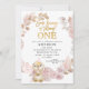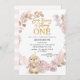 Sweet bunny themed birthday invitation for a baby girl featuring a bunny, a balloon, faux gold foil heading and a pampas grass, pink roses and brown leaf floral wreath. This sweet some bunny is turning one birthday invitation is great for a bunny themed birthday party.