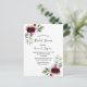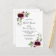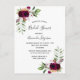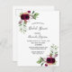 On front: Decorated with dark burgundy flowers, roses, boho style feathers and greenery. An elegant white background. Templates for the bride's name and party details. The name and the text: Bridal Shower are written with a hand lettered style script, bugundy coloured letters.