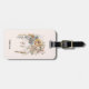 A luggage tag with a pretty bouquet of flowers in neutral colours of brown, peach and orange. A feathered dreamcatcher adds an elegant mystical flair.