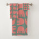 This towel set has a Boho design of coral flowers repeating across the design on a field of green.