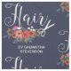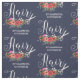 Floral pattern for a hair dresser, hair stylist, or barber in navy blue with Hair written in a charming script, a white pair of scissors, your name, and a pretty floral bouquet with flowers in pink, orange, white, and coral red.