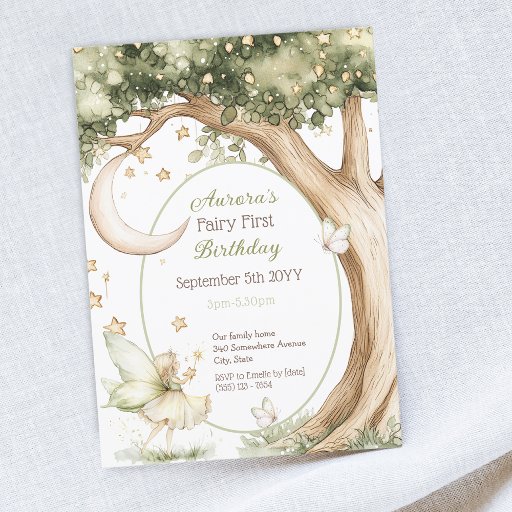 Celebrate your little one’s magical milestone with this whimsical fairy first birthday invitation. Adorned with soft watercolor sweet fairy standing by an old big tree. Details of stars and the moon creates a dreamy enchanted forest vibe. With elegant fonts, a soft green and ivory palette, and a light, airy style, it sets the tone for a truly charming and magical celebration.