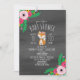 A baby shower invitation featuring an illustration of a baby fox wearing a pink flower crown. Personalise the text. Background is dark grey watercolor inspired design.