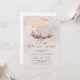 Minimalist design for Baby Shower invitations features Boho copper rusty colours moon mixed sage green foliage. Modern Hand drawing script typography say "love you to the moon and back".