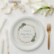 Boho gender neutral baby shower paper plates with your name, event title and date inside of a modern gold geometric frame surrounded by greenery and white flowers. An elegant botanical design that is perfect for a bohemian celebration in the summer. This gender neutral design is great whether you are having a boy or a girl and these custom paper plates add a personal touch to your baby shower. Frame courtesy of: <a href="http://www.freepik.com">Designed by Freepik</a>