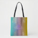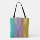 Radiate positivity wherever you go with this stunning, spiritual design. The artwork features an intricate gold filigree mandala pattern—reminiscent of a blooming lotus—split elegantly at the top and bottom. This metallic-style line art sits atop a dreamy pastel rainbow gradient background that fades seamlessly from cool turquoise and teal, through soft lavender purple, into a warm mustard gold. The watercolor-style ombre effect gives the bag a modern, artistic depth.
