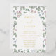This elegant eucalyptus wedding invitation features delicate watercolor greenery framing the design, paired with luxurious gold foil style typography for a timeless and sophisticated finish. The bride and groom’s names are highlighted in shimmering gold-effect lettering, beautifully complemented by soft muted green leaves and subtle blush berry accents. Perfect for garden weddings, rustic venues, vineyard celebrations, or elegant outdoor ceremonies, this botanical invitation blends natural charm with modern refinement. Ideal for couples seeking a greenery wedding theme with a touch of gold elegance.