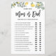 Guess who! Mum or dad? Add this fun and playful botanical baby shower game card to your event. It features watercolor illustrations of lemons and greenery. You can personalise the card by adding back texts. This lemon baby shower guessing game card is perfect for spring and summer showers.