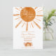 Boho our little ray of sunshine is almost here, with burn orange boho watercolor sun and rainbow, with heart and flowers rainbow baby shower invitation , with a cute rainbow, sun and flowers pattern at the back. Perfect gender neutral baby shower party.