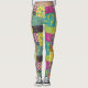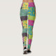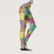 It's like a patchwork quilt for your legs. These patterned leggings have an illustration of boldly coloured floral patchwork quilt in a boho maximalist style in shades of yellow, orange, magenta, turquoise blue, teal, lime green and purple.