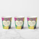 A cream coloured heart shape graphic with faux stitched border is set against a floral patchwork quilt background on these paper cups that have a warm, colourful look and are perfect for boho style weddings. The heart shape is ready to be personalised with the names of the bride and groom and their wedding date.