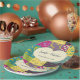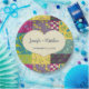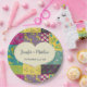 A cream coloured heart shape graphic with faux stitched border is set against a floral patchwork quilt background on this paper plate that has a warm, colourful look and is perfect for boho style weddings. The heart shape is ready to be personalised with the name of the bride and groom and their wedding date.
