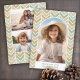 A modern Merry Christmas photo card in shades of pastel gold and green. The front photo is a mod arch with a gold border. The back includes 2 more photos.