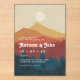 A retro style acrylic wedding invitation for your mountain or forest wedding. This design features a subtly distressed illustration of a mountain and forest landscape in yellow, orange, and navy blue ombre effect, overlaid with your wedding details in white retro font.