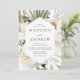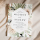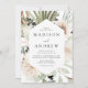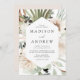 Elegant, tropical floral wedding invitations featuring your names and wedding details at the centre of the design. A geometric frame of cream tropical flowers, palm leaves, pampas grass, and green foliage surround your wedding details. The neutral boho wedding invitations are perfect for your summer beach wedding.