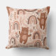 A soft and charming seamless bohemian-style nursery pattern throw pillow featuring adorable brown teddy bears in playful poses, paired with warm, arched boho rainbows decorated with hearts and dotted accents. Designed in a modern Scandinavian-inspired style, the artwork uses warm, muted tones of brown, taupe, beige, and blush pink set against a light neutral background, creating a gender-neutral and soothing aesthetic