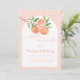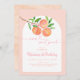 This adorable invitation features hand painted watercolor peaches, peach blossoms and vibrant leaves.