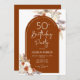 50th birthday party invitation in in terracotta burnt orange and white. Beautiful modern minimalist design with hand painted botanical accents. Features pampas grass, leaves, roses and typography script font. Trendy bohemian styled desert theme perfect for fall, winter, spring or summer. You can choose printed invitations and/or instant download digital template. Perfect for a stylish feminine 50th bday celebration.