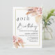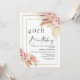 Bohemian inspired birthday invitation featuring two earthy coloured and pale pink floral arrangements with pampas grass and a modern calligraphy image as a heading. Ideal for anyone looking for a bohemian inspired birthday.