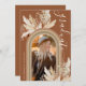 Rustic bohemian graduation party invitations featuring a terracotta background with a rainbow arch feature, a photo of the graduate, watercolor desert dried palm leaves, pampas grass, and a elegant text template that is easy to personalise.