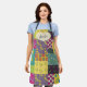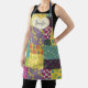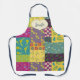 This pretty apron is ready to be personalised with a name. This apron has a illustrated design with the look of a colourful boho style patchwork quilt. A cream coloured heart shaped graphic with faux stitching accents is ready to be personalised with a name in navy blue script or cursive writing.